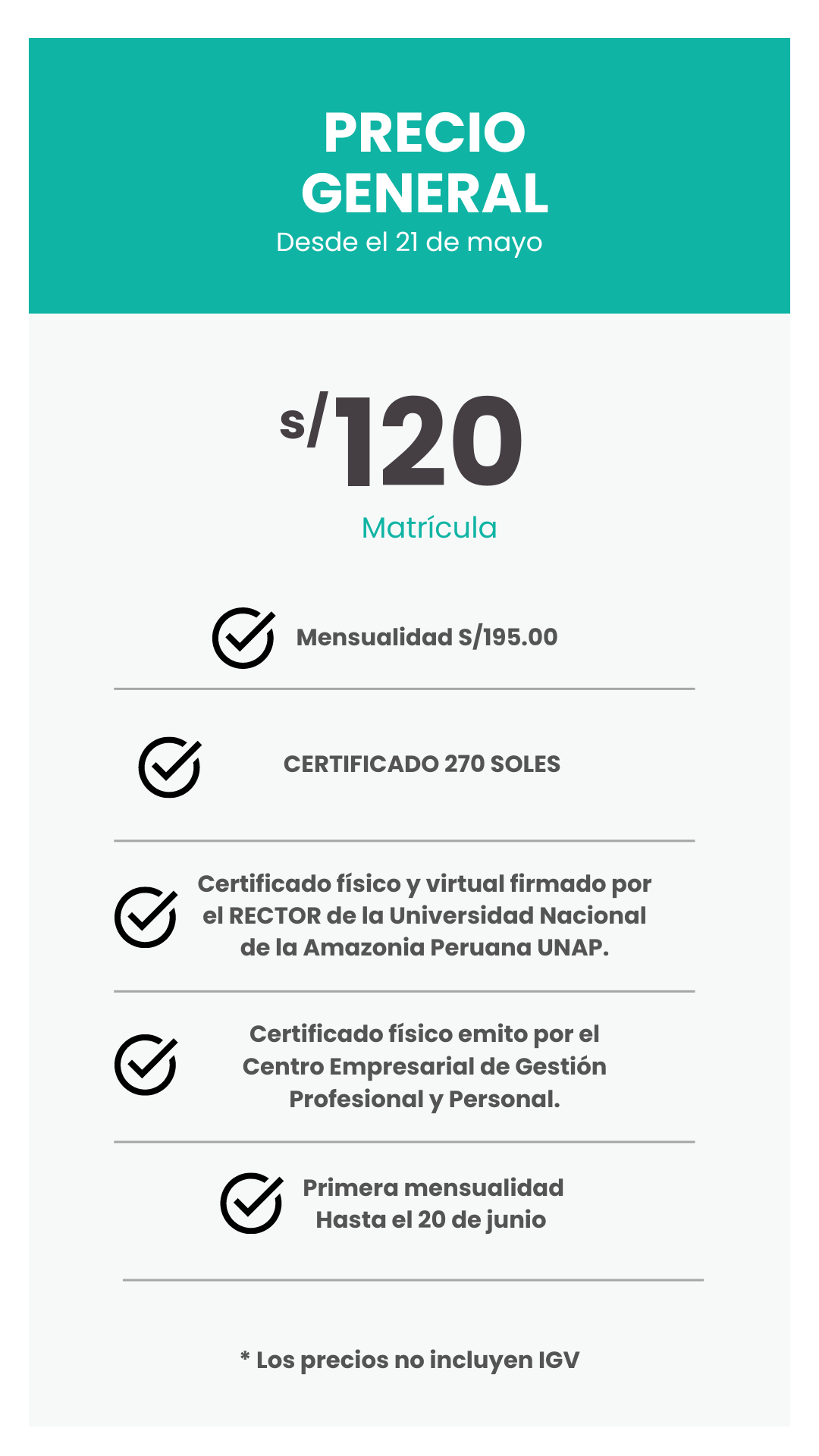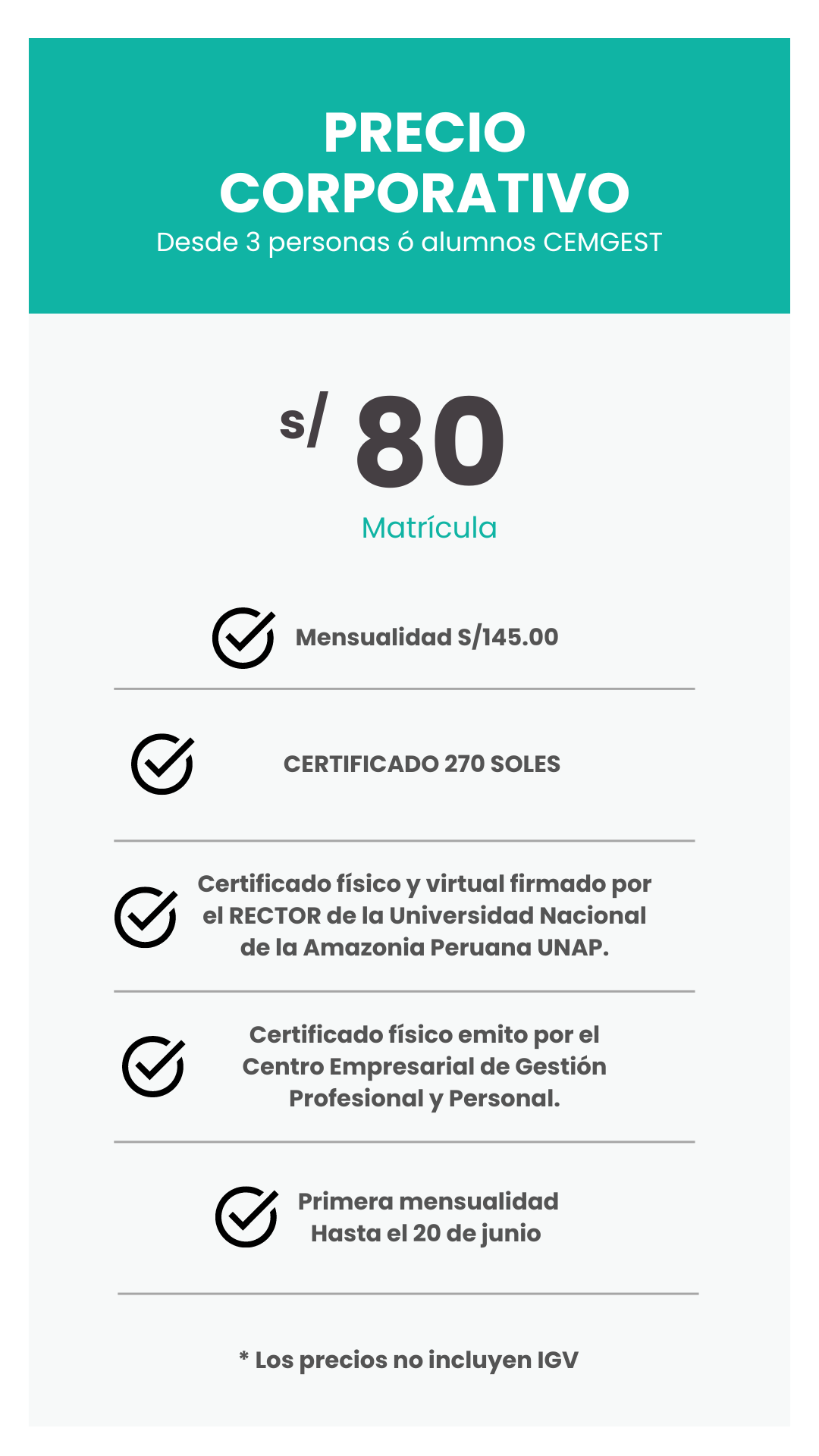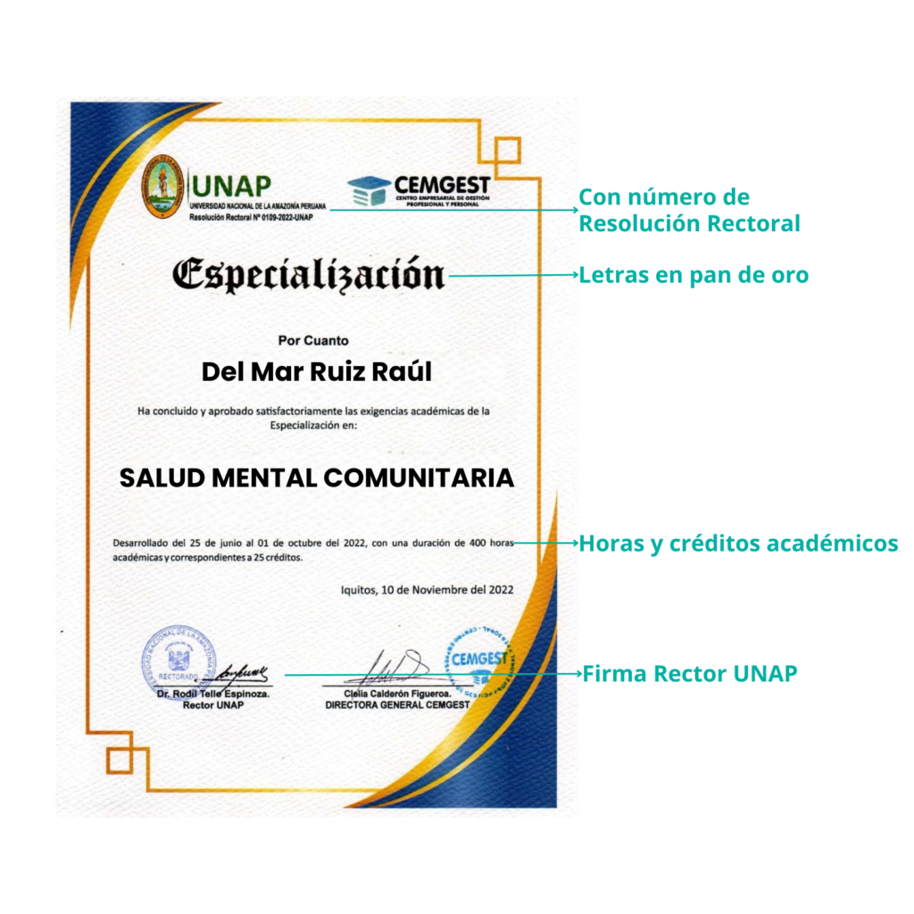 • Los participantes que cumplan con el 80% de asistencia a clases y obtengan una nota mínima de 12, recibirán el certificado correspondiente.