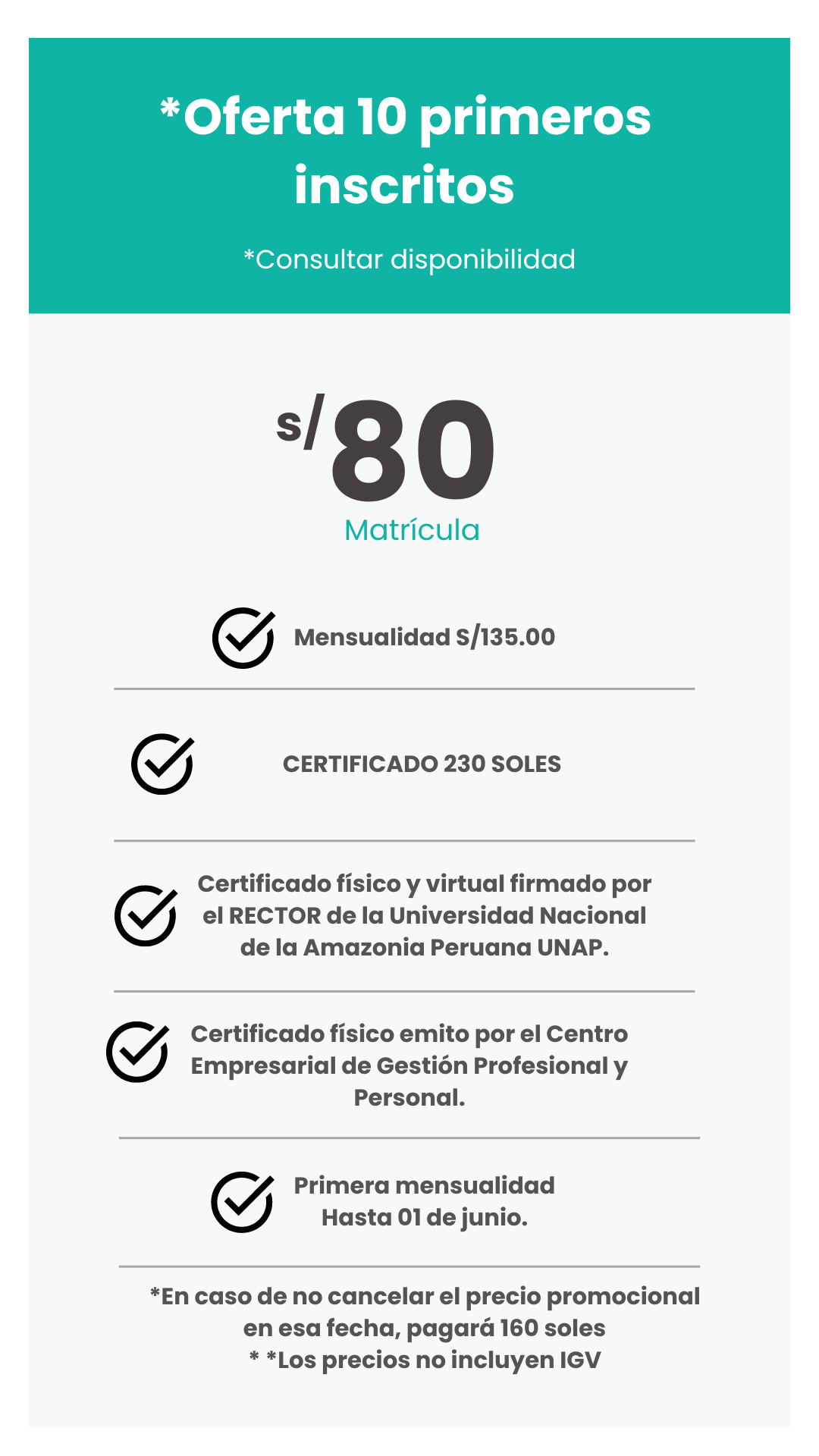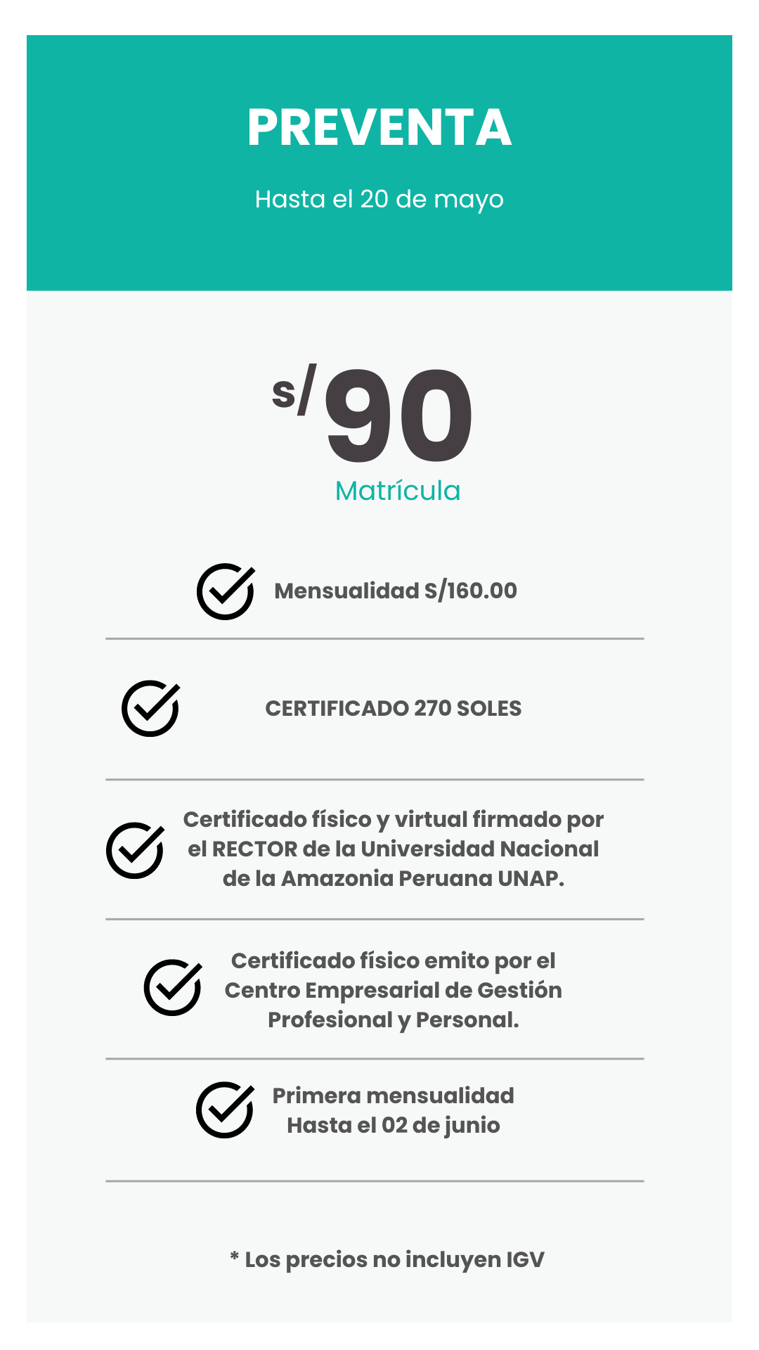 • Para apertura el grupo, es necesario contar con un mínimo de 45 inscritos, en caso de no tenerlo se postergará el inicio entre 30 a 45 días, según la cantidad de números de inscritos que falten.