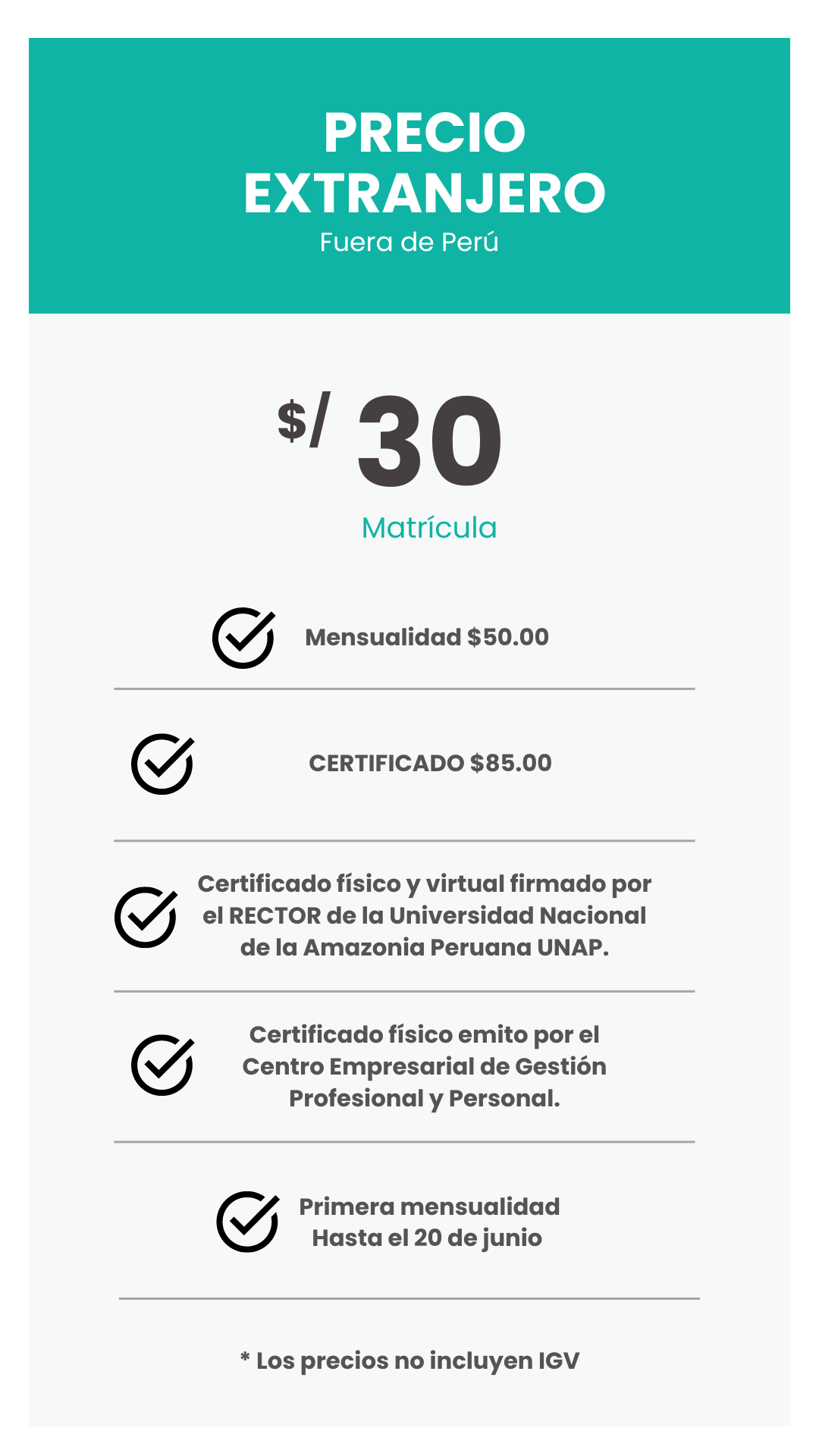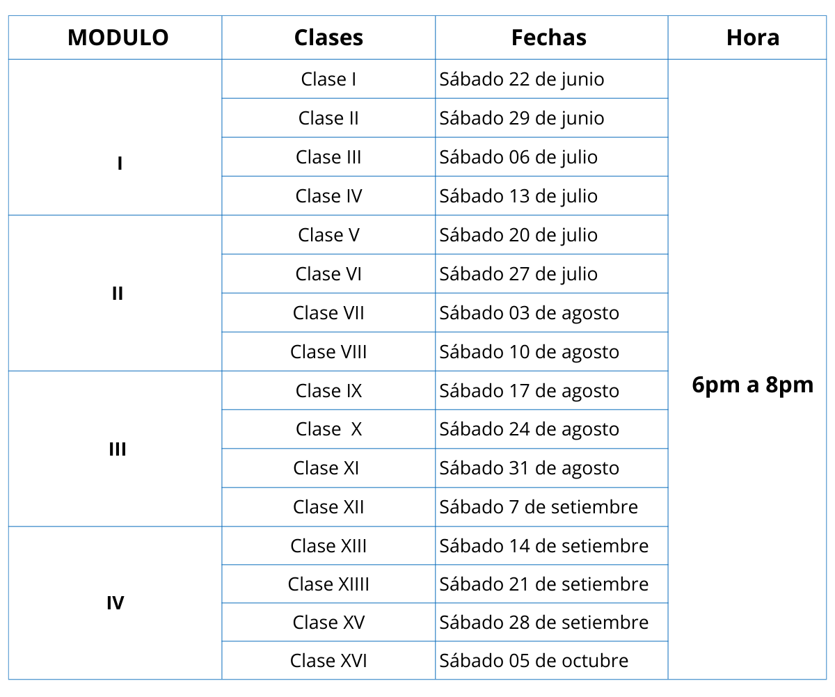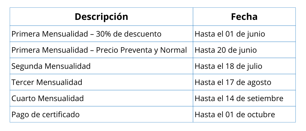 • La institución se reserva el derecho de modificar las fechas de clases o la plana docente por motivo de fuerza mayor o disponibilidad del docente, garantizando que la calidad y las horas del curso no se vea afectada. Toda modificación será comunicada anticipadamente a los participantes.
